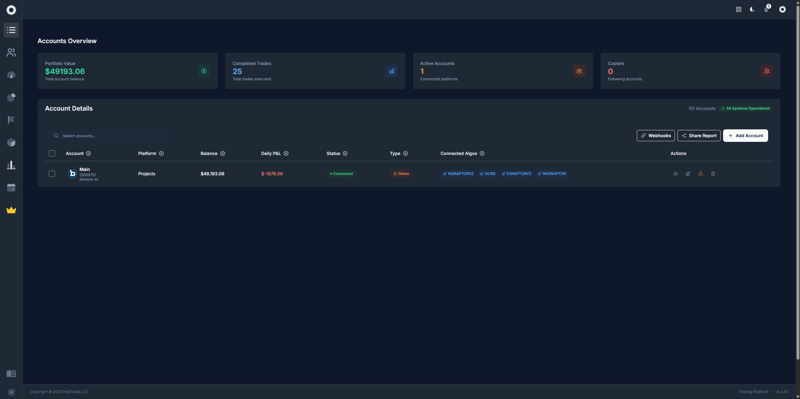 To start automated trading, copy trading, or webhook-based algorithmic trading, you first need to connect a broker account to Hextrade. Once connected, your account appears in the accounts table and is available for algorithms, copy groups, and manual trading.Adding an Account