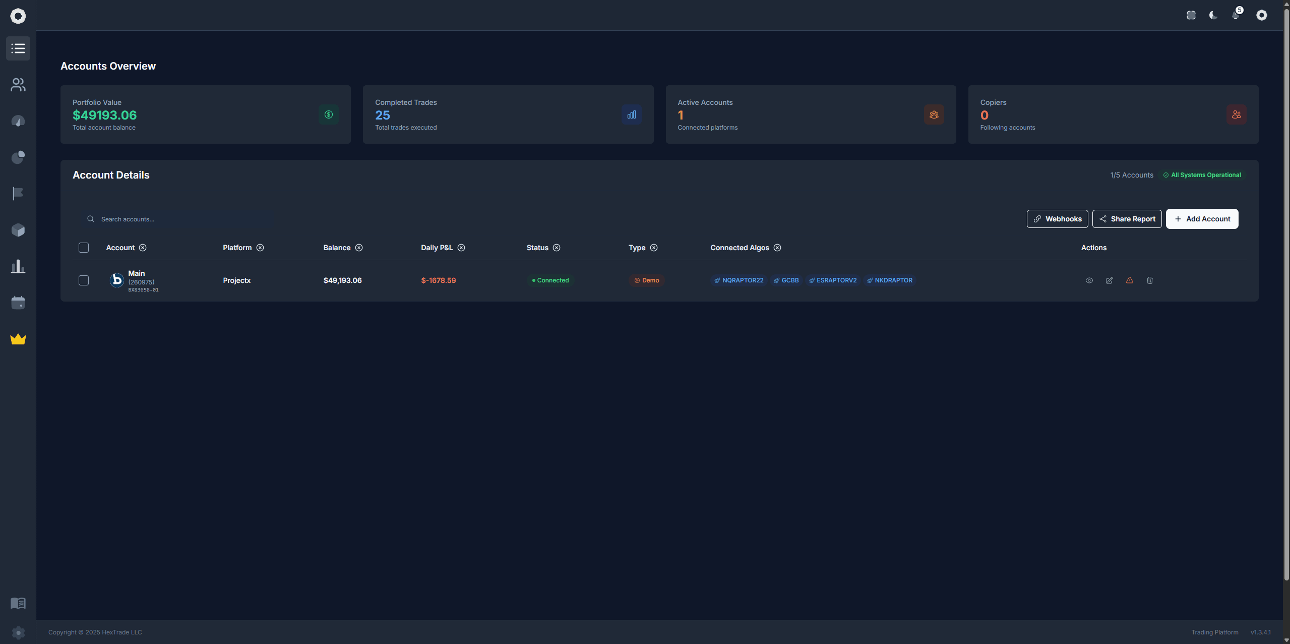 Navigate to dash.hextrade.io/accounts. Youβll see a table listing all your connected accounts.